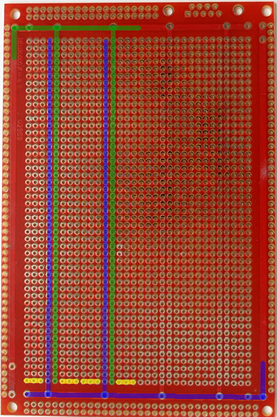 BeschreibungLochraster Platine Epoxyd FR4, 1.6mm mit VDD und GND Bahnen. Zwischenpins sind in 3-Gruppen verbunden.